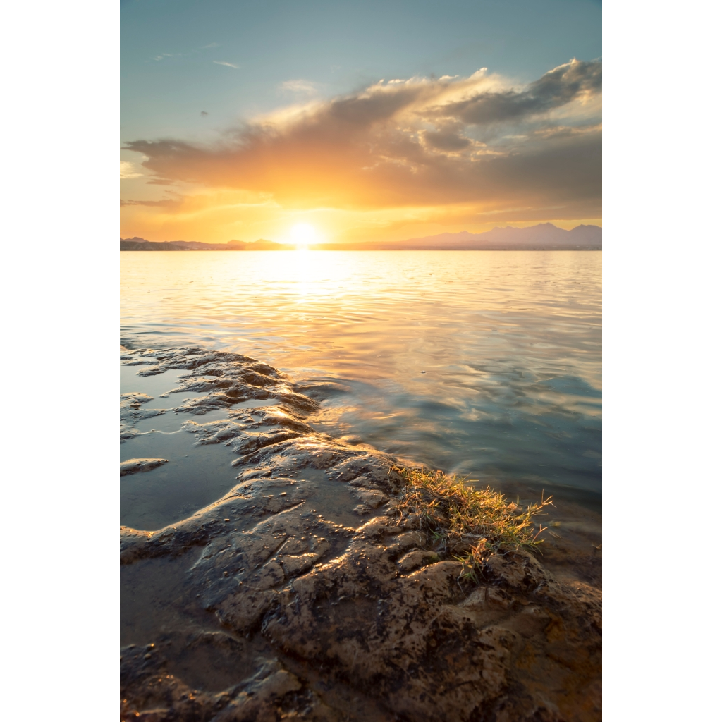 Most shorelines in Lake Havasu are typically: muddy, covered in shells, and sand. This particular shoreline I discovered has a semi-hard surface. This image was captured on my second visit to it. I wanted to take advantage of the colorful sunsets our rainy 2022 monsoon season had brought us. When I first got to the shoreline my lens was fogging up from the humidity. I took my time trying out different compositions before I settled on this one. I loved how the sunlight was lighting up the tips of this grass growing on the semi-hard surface. My foggy lens cleared up as the sun got closer to setting, and I was able to capture this scene.